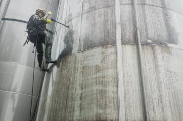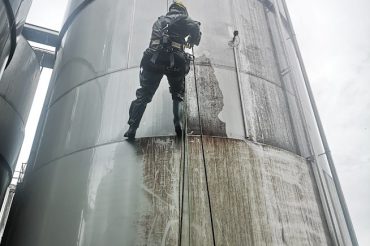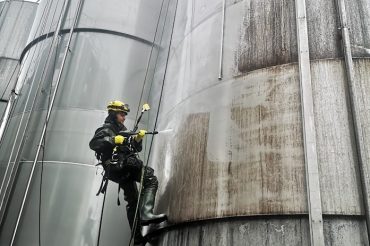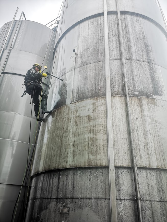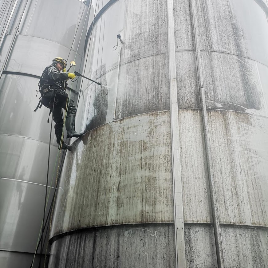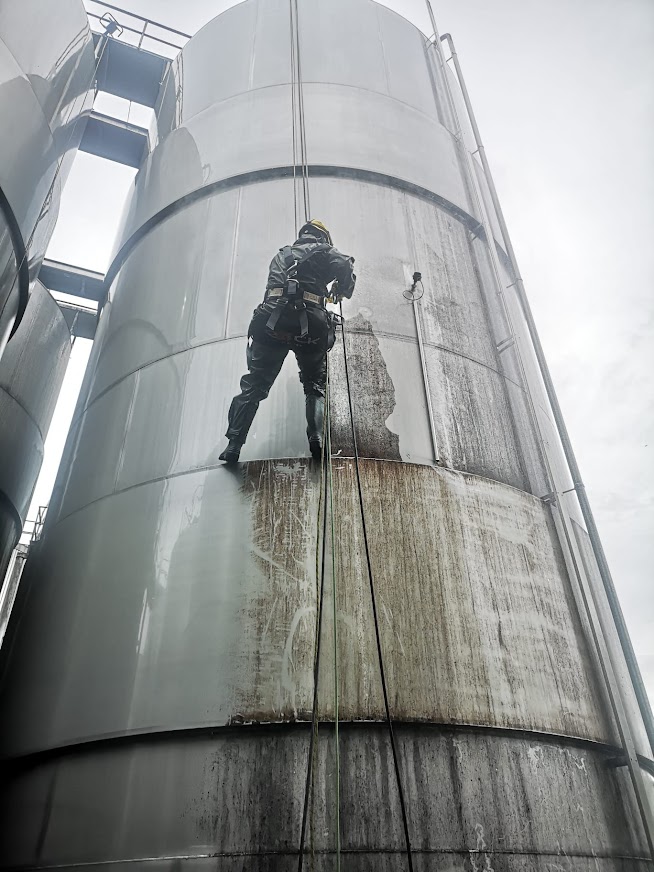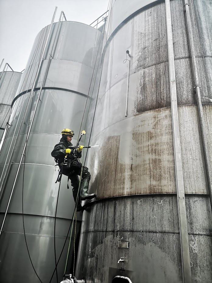Efetuamos a limpeza de Depósitos numa Fábrica, com a utilização de uma máquina de lavar a alta pressão com produtos adequados pelo acesso de cordas (rappel).